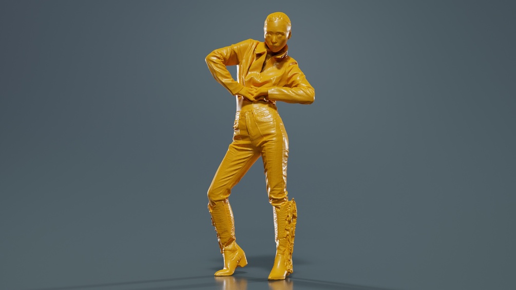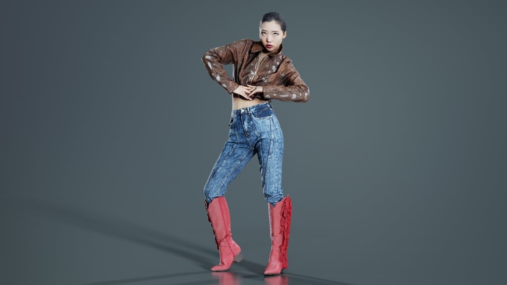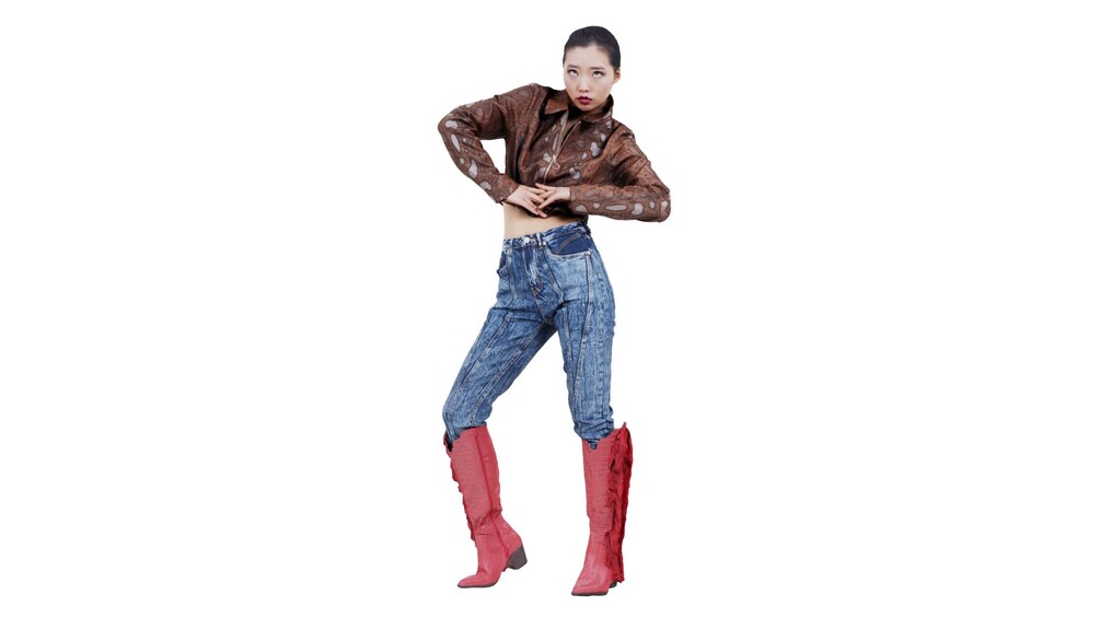 3D scanned model featuring a woman in jeans and boots posing for the camera. This model, asian woman wearing red boots 009, has been created using photogrammetry from a real world object.
