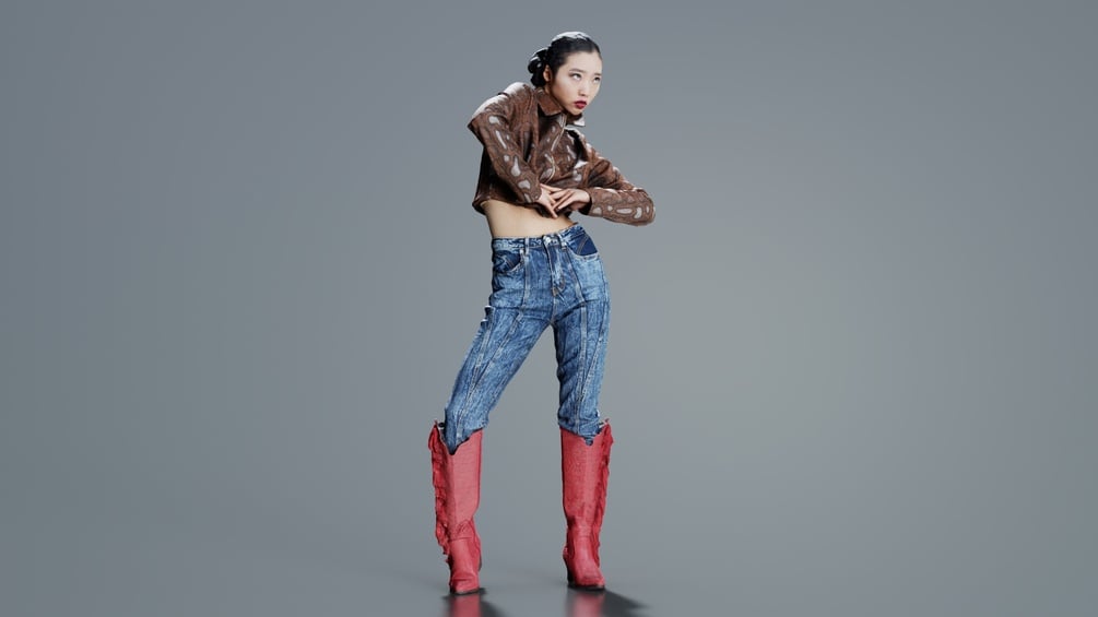 3D scanned model featuring a woman in jeans and boots posing for the camera. This model, asian woman wearing red boots 009, has been created using photogrammetry from a real world object.