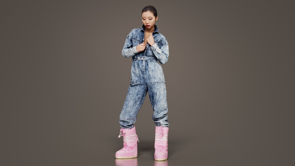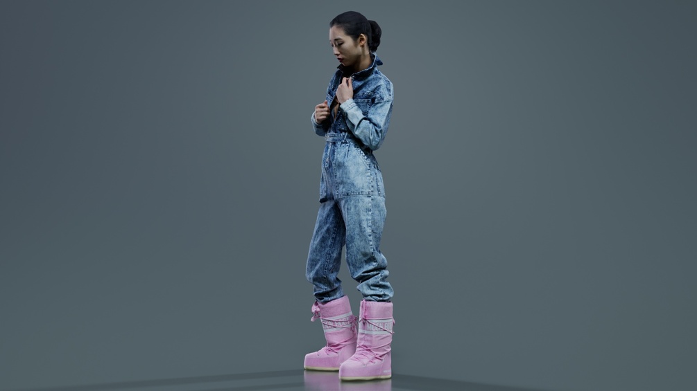 Polygonal Miniatures presents asian woman wearing jeans salopet 001, a model from our 3D scanned catalogue. The model, a woman in a denim jumpsuit and pink boots, is obtained by photogrammetry, and scanned using SLR camera's.