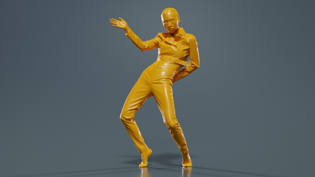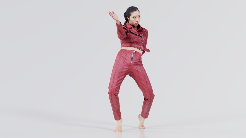 This model, asian woman wearing red leather snake print outfit 003, has been created using photogrammetry from a real world object. It is featuring a woman in red snake skin pants and jacket.