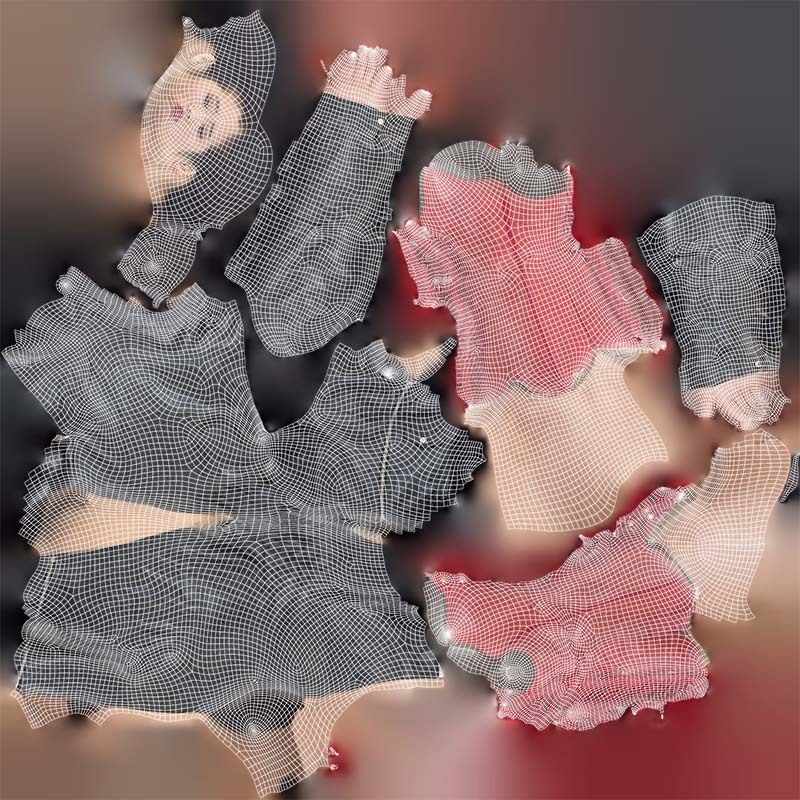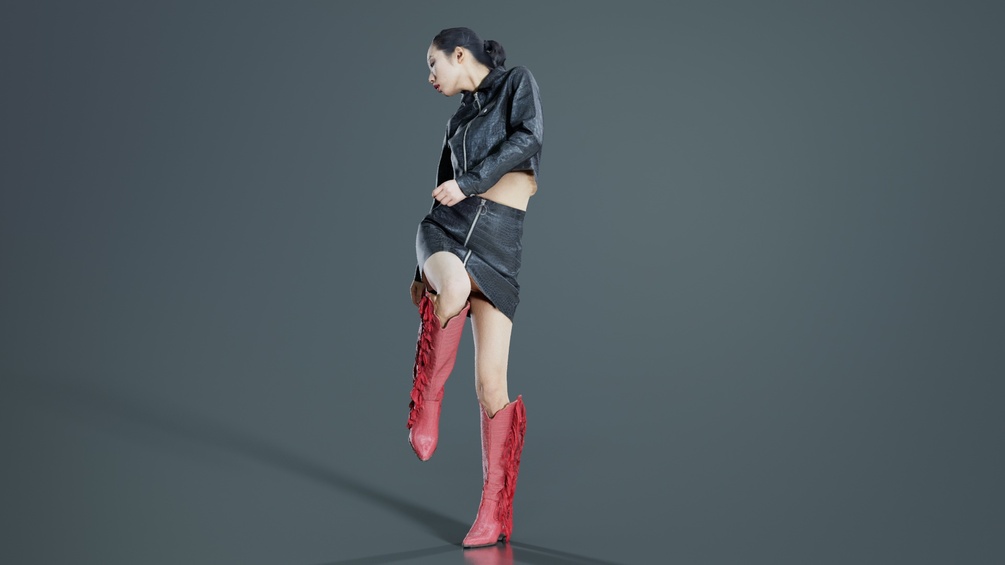 3D scanned model featuring a woman in a leather jacket and red boots. This model, asian woman wearing black crocodile print vinyl outfit, has been created using photogrammetry from a real world object.